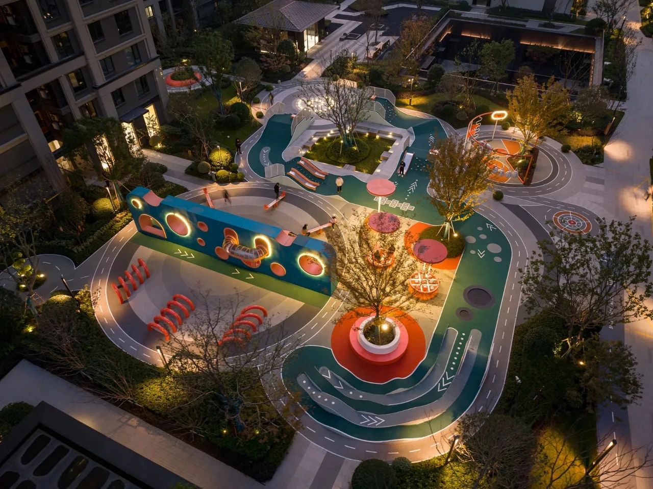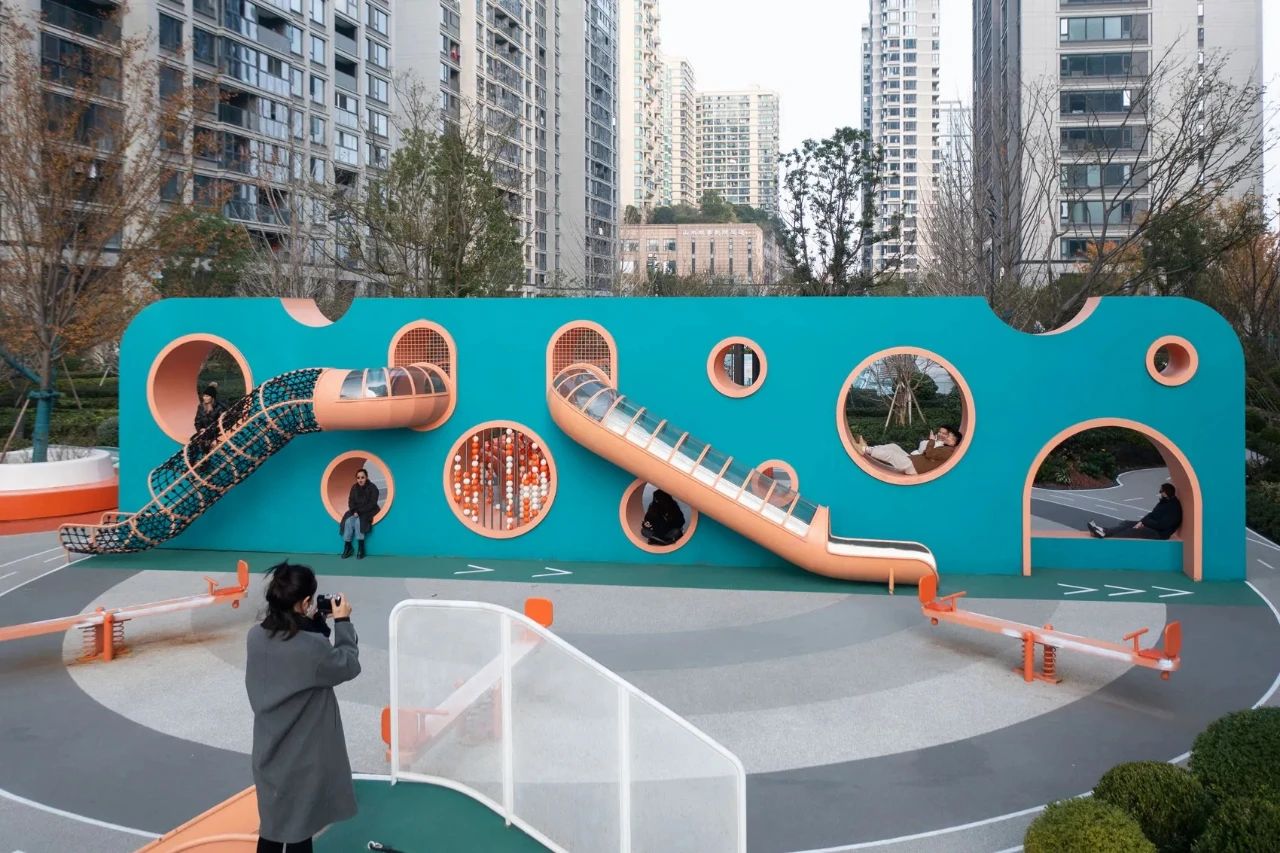 為了讓周圍樓的居民都能看到、辨認(rèn)和可讀,設(shè)計(jì)師用醒目的藍(lán)綠色創(chuàng)造了一個(gè)巨大的漢字,然后把它變成了一個(gè)游樂(lè)場(chǎng)。當(dāng)書(shū)法筆畫(huà)被幾何化時(shí),非常適合成為充滿障礙挑戰(zhàn)性和有趣功能性的游樂(lè)活動(dòng)方式,以鼓勵(lì)社交互動(dòng)。因此,它的名字,M?(my)Way-做我想做。